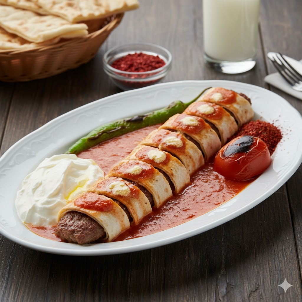 Özel baharatlarla hazırlanmış dana kıyması, lavaşa sarılarak ızgarada pişirilir; yoğurt ve tereyağlı sos eşliğinde servis edilir.