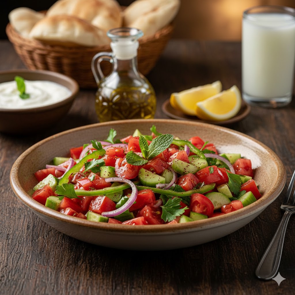 Taze domates, salatalık, yeşil biber ve soğanın uyumlu birlikteliği; zeytinyağı ve limonla tamamlanır.
