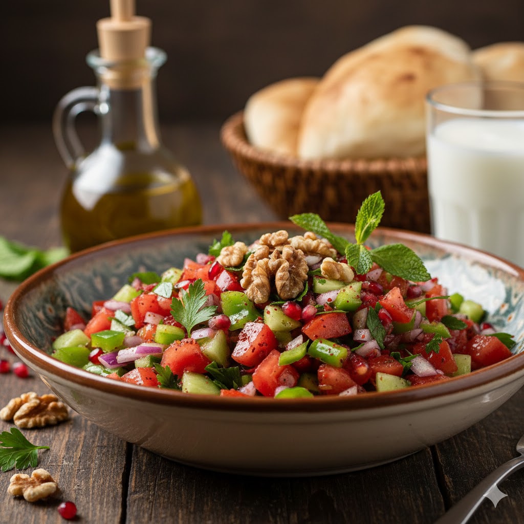 İnce doğranmış domates, biber ve ceviz; nar ekşisi ve zeytinyağıyla buluşur.