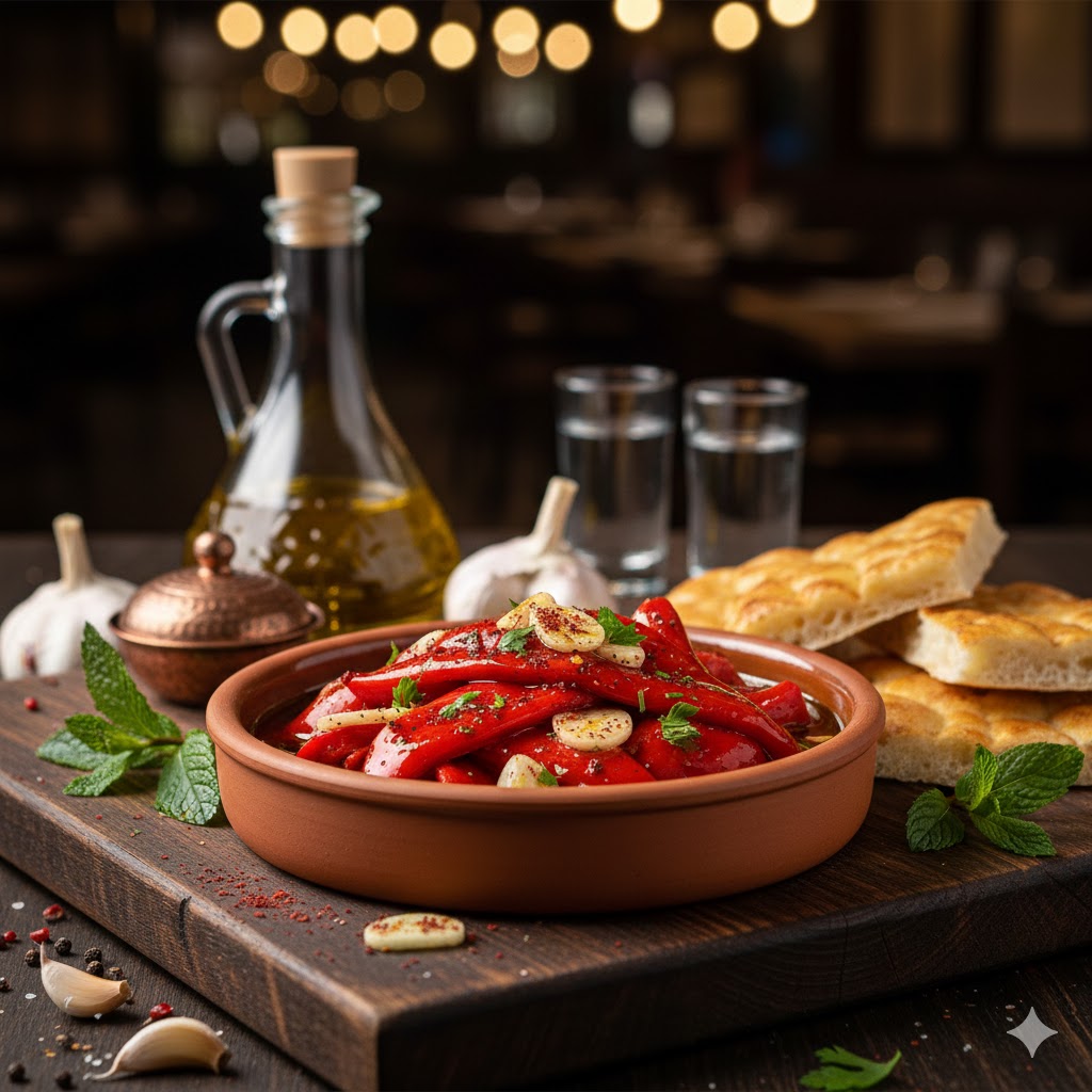 Köz ateşinde pişirilmiş biberler, kabukları soyularak zeytinyağı ve sarımsakla harmanlanır.