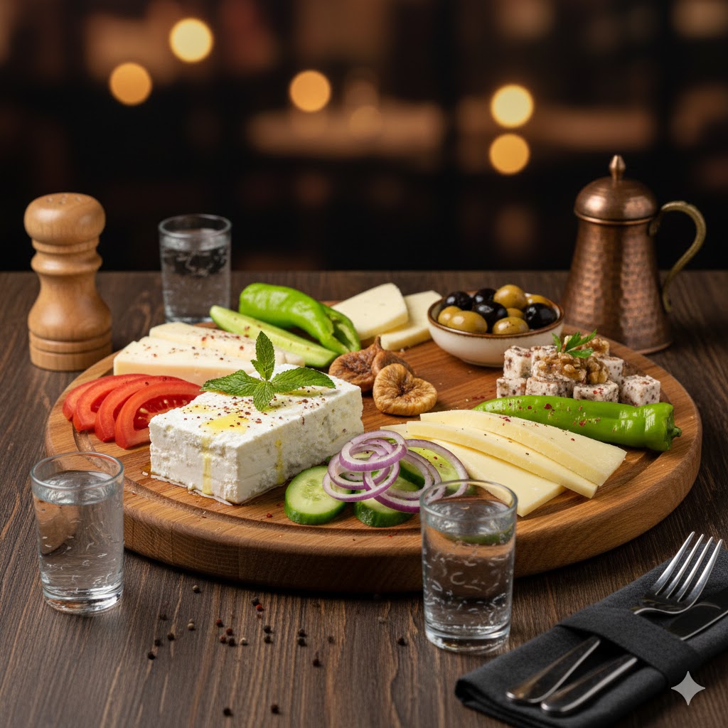Özenle seçilmiş peynir çeşitleri; taze domates, salatalık ve yeşillik eşliğinde servis edilir.