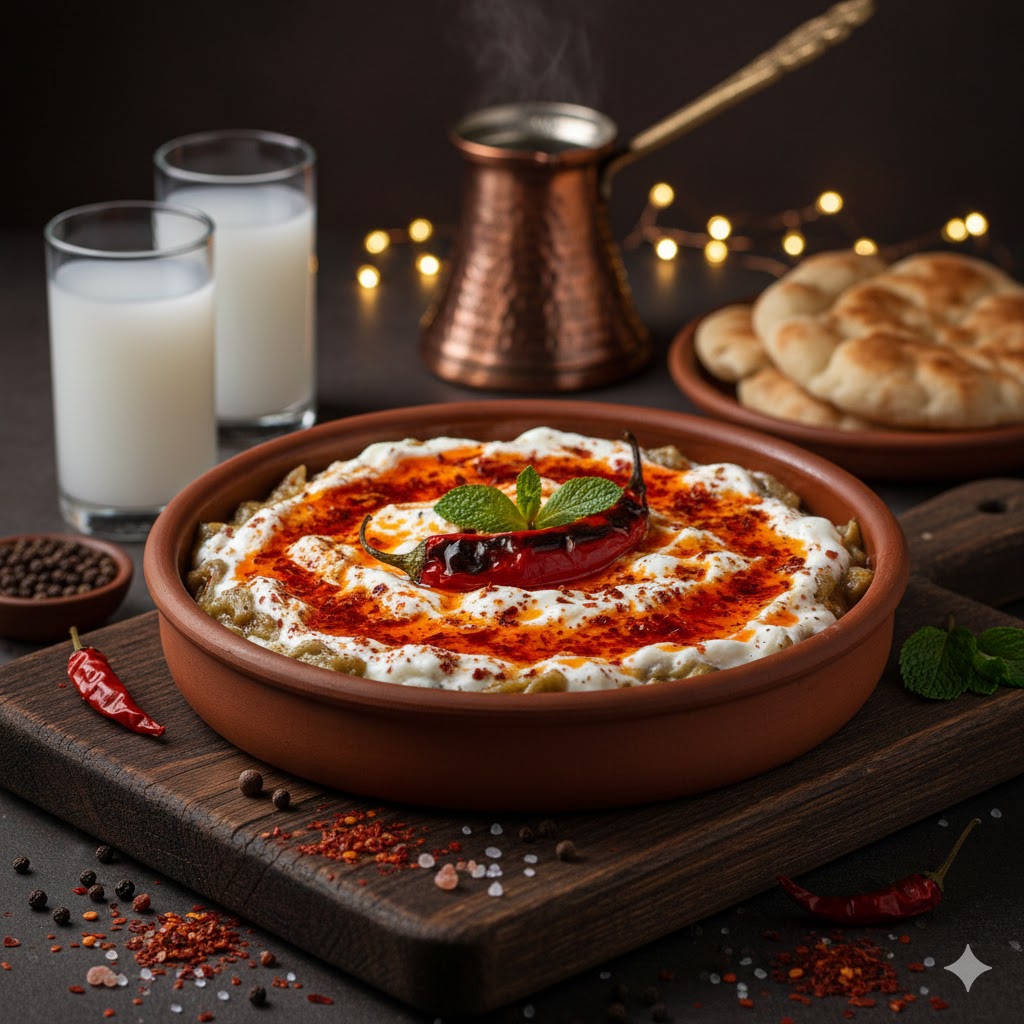 Közlenmiş patlıcan, süzme yoğurtla buluşturulur; üzeri kızdırılmış tereyağı ve atom acı biberle tamamlanır.